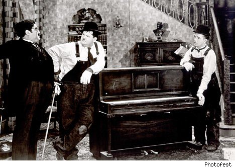 In the video, deadpan all the while, Shea sticks an odd-shaped piece of paper on his nose and proceeds to straddle the drums, hump them, bump them, milk them, tangle with them, move them, disassemble them, pratfall over them and use them as a staging area for a finger puppet show. At one point, it looks like Laurel and Hardy moving a piano, but with the bass drum standing in for Ollie. The audience seems too intimidated by the 'seriousness' of the context to respond as I did-laugh out loud. It's just not done. Mr. Wooster.